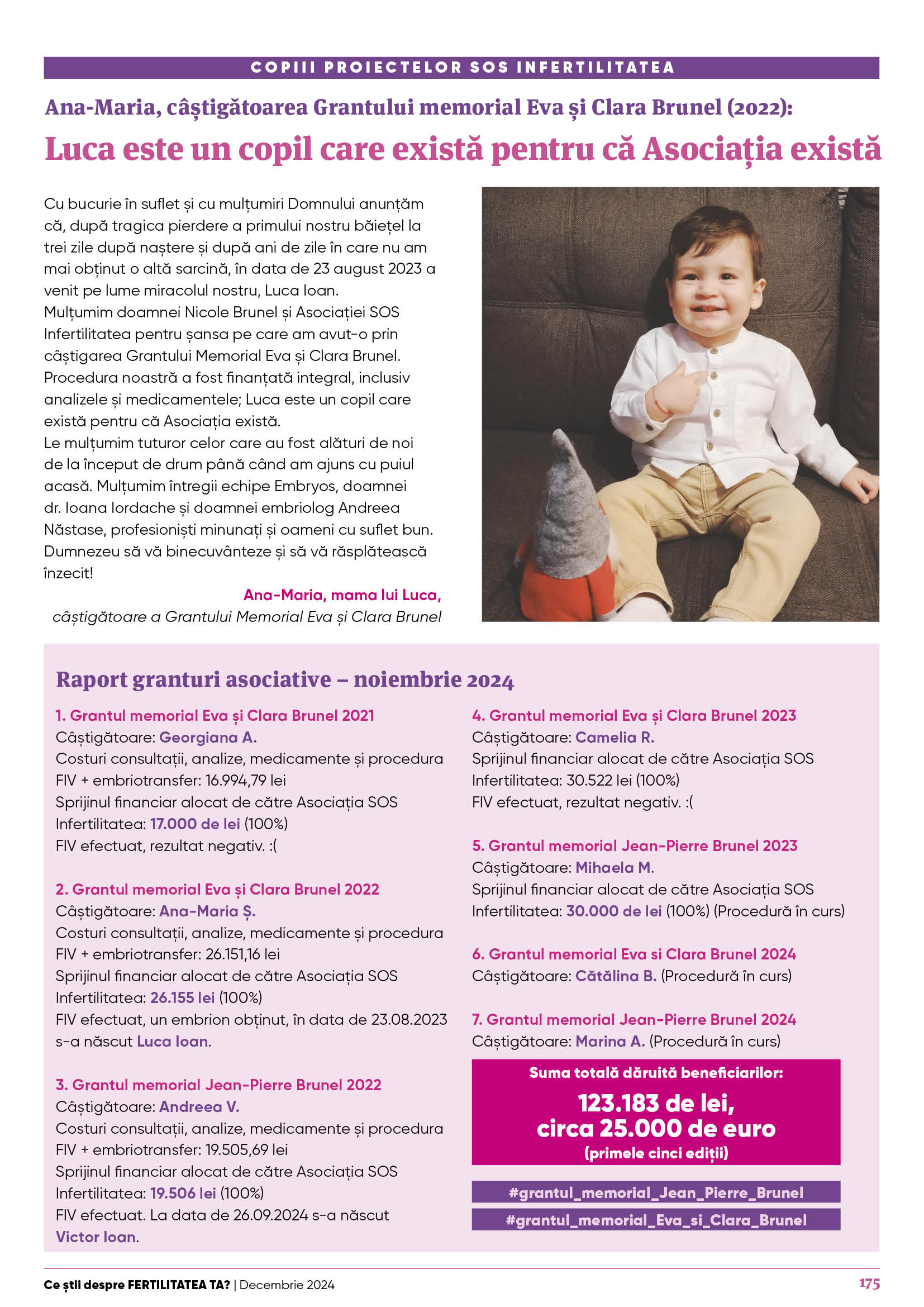 Mulțumim doamnei Nicole Brunel și Asociației SOS Infertilitatea pentru șansa pe care am avut-o prin câștigarea Grantului Memorial Eva și Clara Brunel. Procedura noastră a fost finanțată integral, inclusiv analizele și medicamentele – Luca este un copil care există pentru că Asociația există.