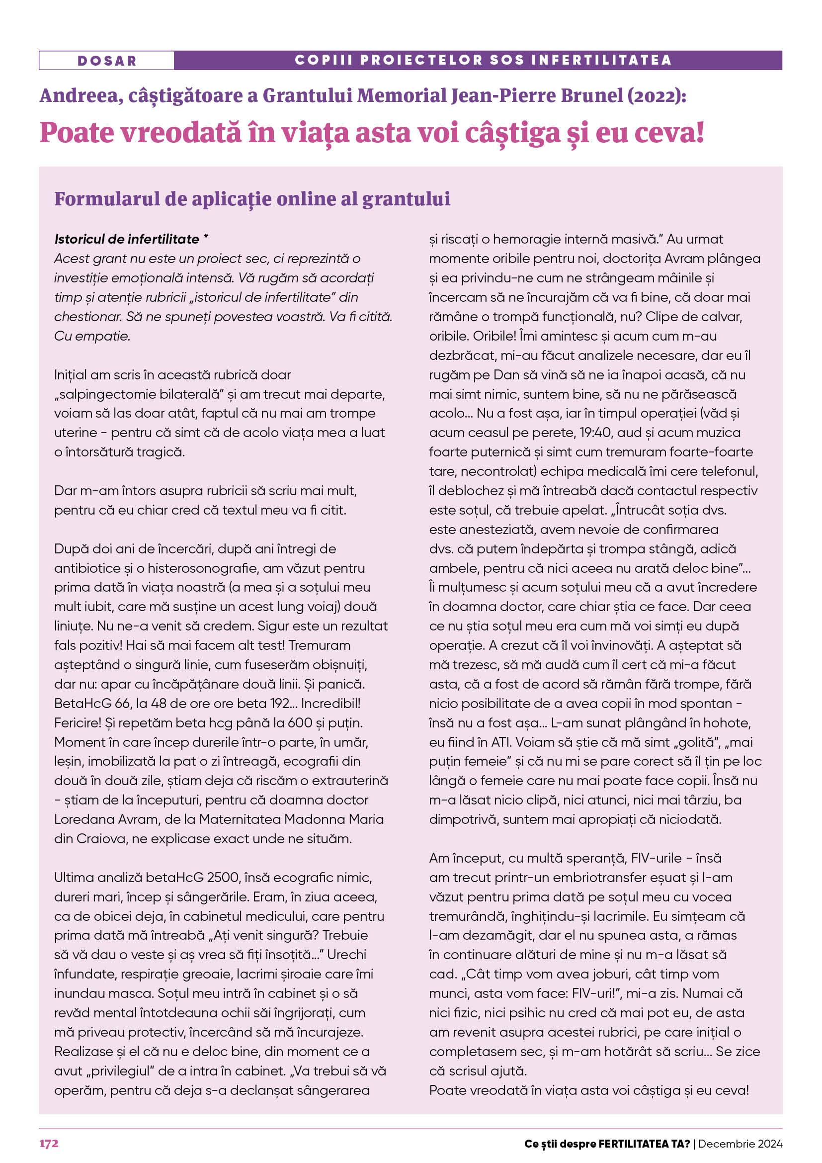 Andreea a început aplicația la grant scriind simplu: „salpingectomie bilaterală”. Dar povestea ei era mult mai profundă și dureroasă. O viață marcată de pierderi, intervenții chirurgicale dificile, diagnostice dure și nesiguranță.